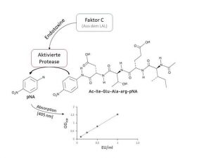 Abbildung : Ein kleines Volumen der Probe (10μL) wird mit dem Limulus-Amöbozyten-Lysat kombiniert. In der Probe vorhandene Endotoxine aktivieren die proteolytische Aktivität von Faktor C im LAL. Die Aktivität von Faktor C wird durch Zugabe von chromogenem Substrat gemessen. Der abgespaltene p-Nitroalinin (pNA)Rest kann durch Messung der Absorption bei 405nm gemessen werden. Extrapolation gegen eine Standardkurve erlaubt die Quantifizierung von EU/ml.